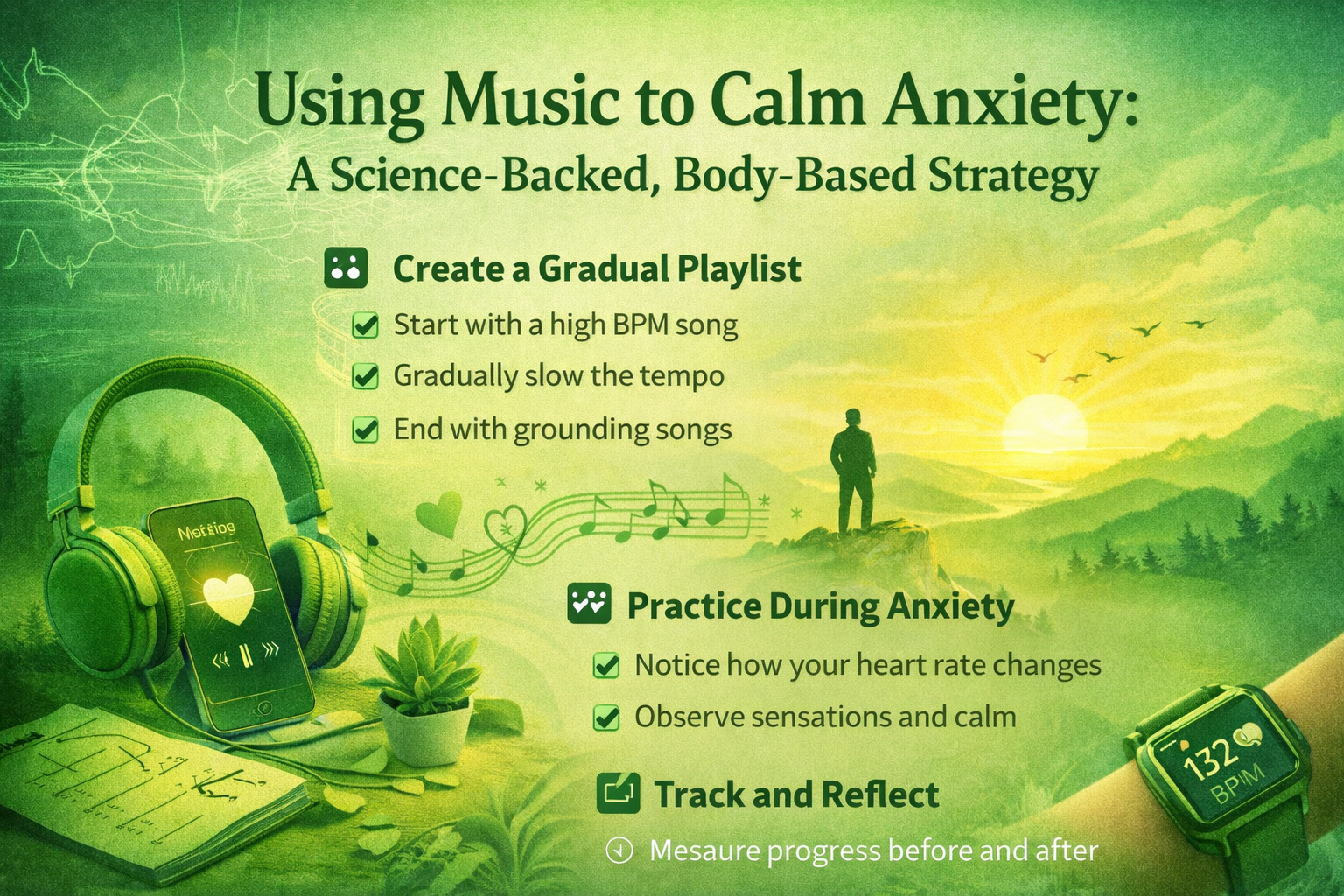 Music is a somatic, body-based strategy. It calms the nervous system directly rather than trying to think your way out of anxiety. It is simple, accessible, and even enjoyable which makes it more likely you will actually use it.